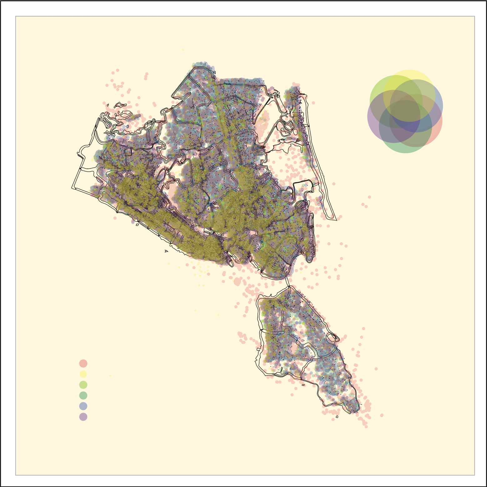 The gathered frequencies consist of layering data points plotted on a map of New York the points reflect 311 noise complaints, NYPD Arrests, graffiti removal calls, emergency management responses, NYPD complaint calls, and motored Vehicle collisions. These points reveal spaces of high intensity and high frequency. Crown Heights, not surprisingly based on previous investigation being one of the main epicenters of these frequencies.